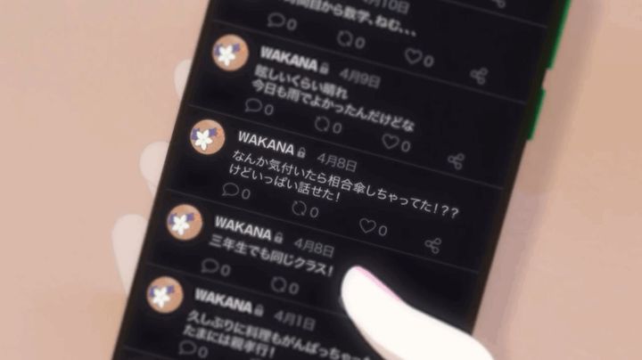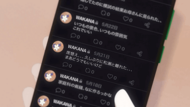 カフェに入り、自身の日記SNSを読み返す若菜。4月8日の日記には