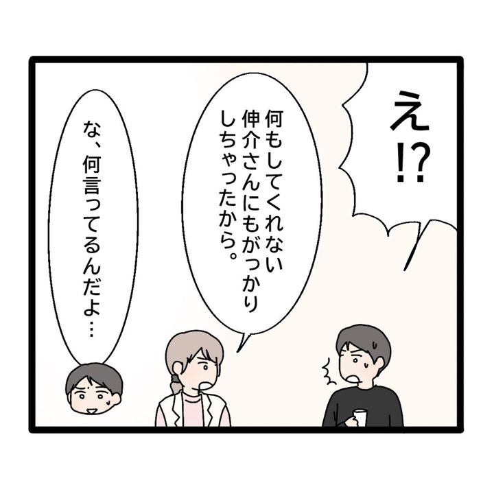伸介は思ってもいなかった言葉に驚いたようで「え!?」と固まります。私は「何もしてくれない伸介さんにがっかりしちゃったから。」と伝えました。伸介は「な、何言ってるんだよ・・・」と言葉を詰まらせました。