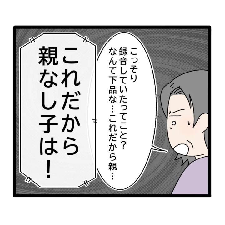 義母はボイスレコーダーと聞き、少し焦った様子で「こっそり録音していたってこと?なんて下品な・・・これだから親・・・」と言いかけた時、私はボイスレコーダーを再生しました。すると『これだから親なしの子は!』と怒鳴る義母の声が流れました。