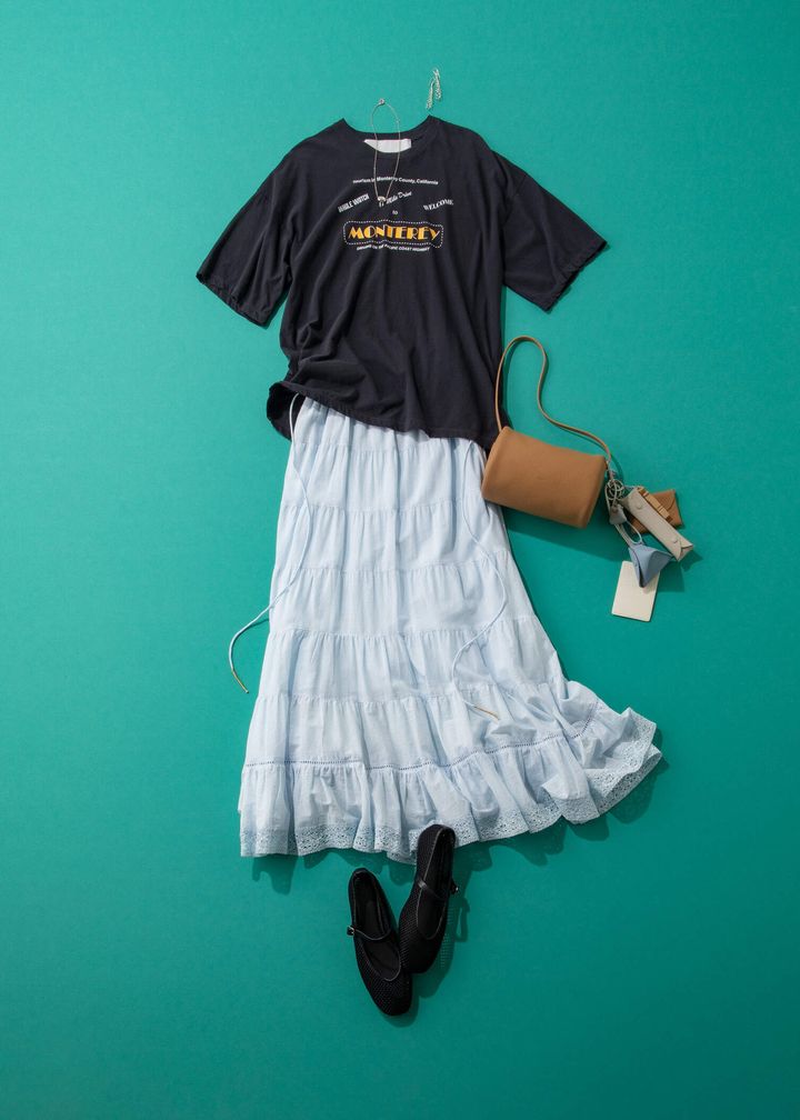 子どもと一緒の夏の花火大会やお祭りは暑いし実はけっこう疲れるイベント。ロゴTで動きやすさは確保しつつ、夜のお出掛けだからロマンティックなレーススカートで華やぎは死守したい。