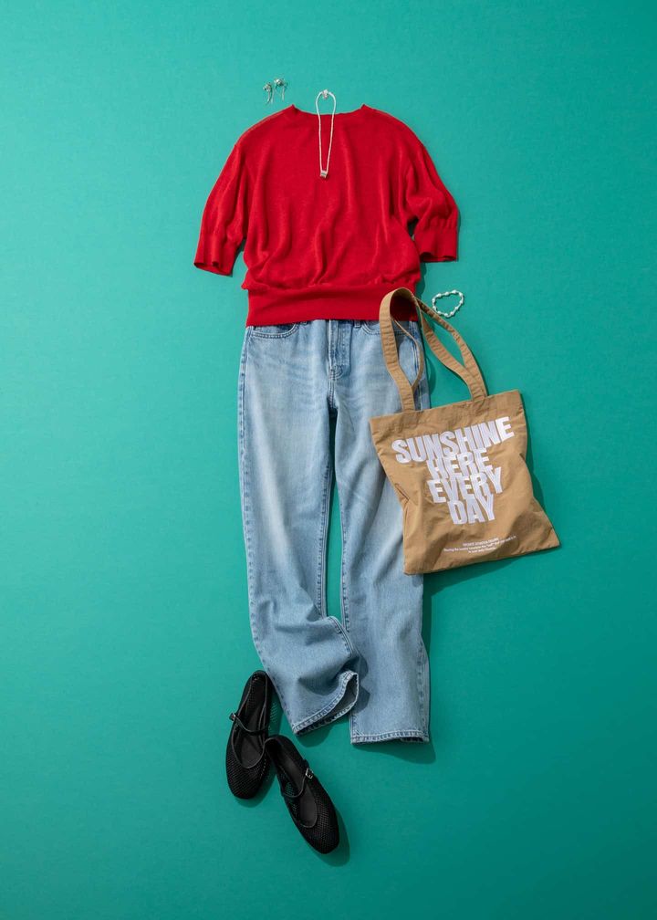 シューズは履き回し。ニット¥20,900(ウィム ガゼット)パンツ¥3,990(ユニクロ アンド ジェイ ダブリュー アンダーソン/ユニクロ)バッグ¥4,950(ル タロン)イヤリング¥3,400<KRONOS>ブレスレット¥5,500<タラッタ>(ともにロードス)ネックレス¥22,000(ウノアエレシルバーコレクション/ウノアエレ ジャパン)