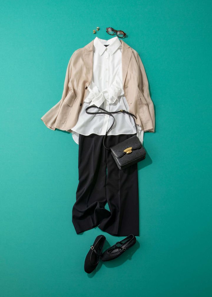 シューズは履き回し。ジャケット¥49,500(ハイク)シャツ¥13,200(ノーク)パンツ¥8,990(アンフィーロ/アンフィーロ<オンワード樫山>)バッグ¥39,600(トーヴ/アンソロジー)メガネ¥26,400(ブレース/フラッパーズ)ピアス¥3,960(ヘンカ/ロードス)