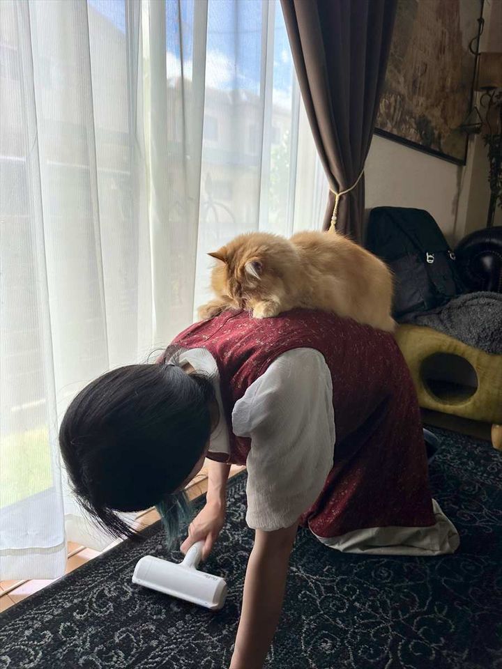 床をコロコロクリーニングする女性の背中に乗っているネコ。 苦労する飼い主さんと毛が落ちる事も気にした様子も見せないのんびりとしたネコ、そんなの関係性が垣間見えるワンシーンが話題となっています。