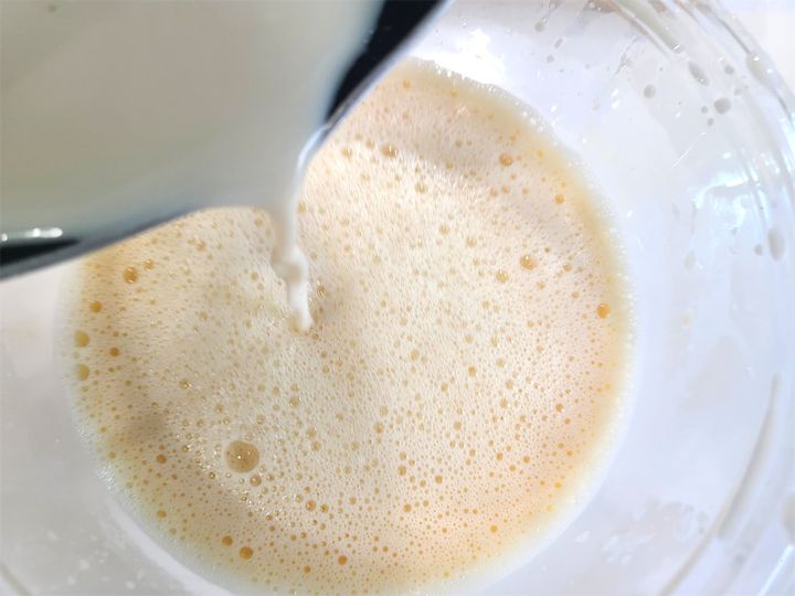 4. 耐熱ボウルに卵を割り入れ、あればバニラ(今回はバニラエッセンスを3滴ほど)を入れてよく混ぜ合わせます。3を少しずつ加え、よく混ぜ合わせます。
