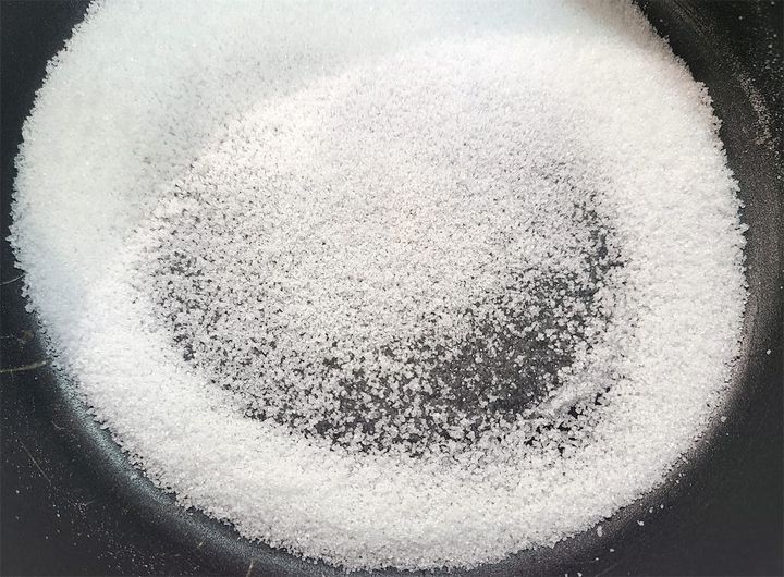 2. 別の鍋に砂糖を入れ、弱火で加熱し溶かします。このときスプーンなどでかき混ぜず、鍋を揺らして混ぜるようにします。3分ほど経つと、少しずつ砂糖が溶け出してきます。