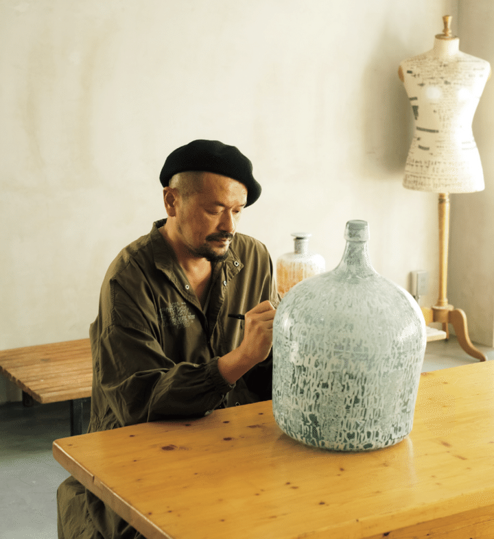 「制作のきっかけはギャラリー『galerie a』の秋吉伸彦さんとの出会い。俺の初期のタギングを見ていてくれたみたいで、国内外の古物を生かした作品制作の相談があったんです。秋吉さんとの関係はバンドに似ていて。彼がトラックメーカーという立ち位置で古物を用意して、俺はそれに対してスポークンワードする。つまりインタープレイなんです」