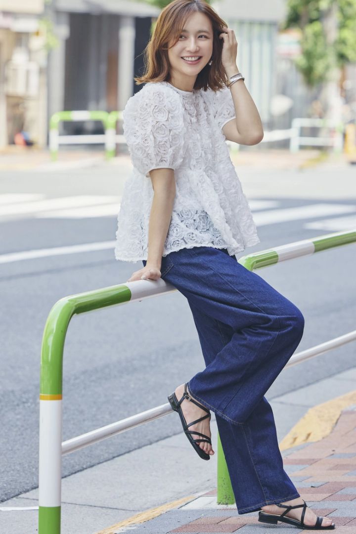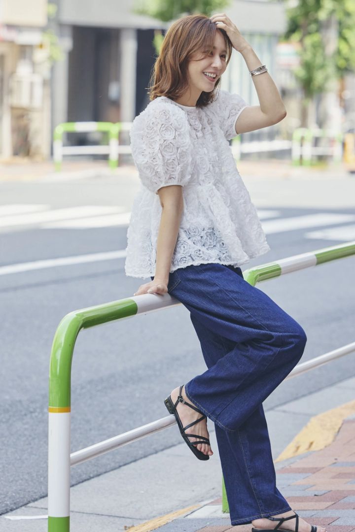 ブラウス¥17,600/ORGUE、デニム¥22,000/ニードバイヘリテージ(アバハウスインターナショナル オンラインストア)、ピアス¥3,630/mimi33(サンポークリエイト)、バングル¥1,870/アネモネ(サンポークリエイト)、リング¥4,320/アビステ、靴¥6600/ダブルエーオリエンタルトラフィック