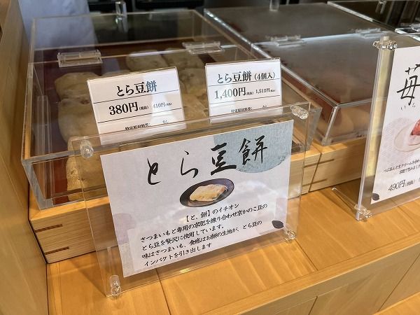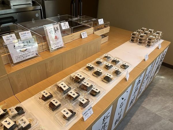 「とら豆餅(4個入り)」(1512円)、「苺餅」(529円)、「黒胡麻あんこ餅」(345円)、「七味唐辛子磯部餅」(345円)、「山椒磯部餅」(290円)、「黒蜜きな粉餅」…などなど、多種多様なお餅が並んでいます!
