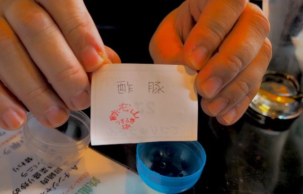 サンプルとして出してくれた、お菓子の個数の書かれた紙をひっくり返すと、そこには「酢豚」と書かれている。