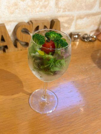 セットのミニサラダはブロッコリーと水菜とレタスとトマトがグラスに入っています。オシャレ~! 胡麻ドレッシングをかけて美味しくいただきました。