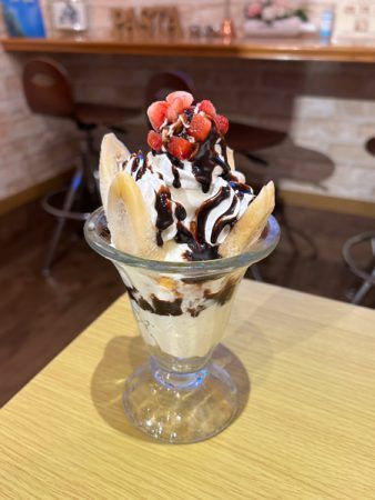 バニラアイスにトッピングされているのは、なんとフローズンバナナ。シャリシャリとした食感が楽しめます。 かけるソースはチョコレートかブルーベリーを選ぶことができ、私はいつもチョコレートを選んでしまいます。 パスタを食べた後にお腹に余裕があれば絶対に食べたい一品です。