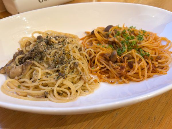 「ナポリ・ルージュ」はナポリタン風のトマトパスタで、マイタケとシメジとエノキと挽肉が入っています。ナポリタンのようなケチャップ感はあまりなく、ベタつかずサラッと食べられる印象です。同じトマト系でミートソースと迷いましたが、この日はサラッとしたものが食べたかったのでこちらを選びました。