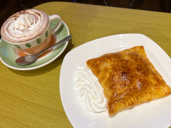 注文があってから焼き上げているというチーズパイは、チーズの塩味と甘い生クリームの組み合わせが癖になります。ココアを注文して一緒にいただきました。