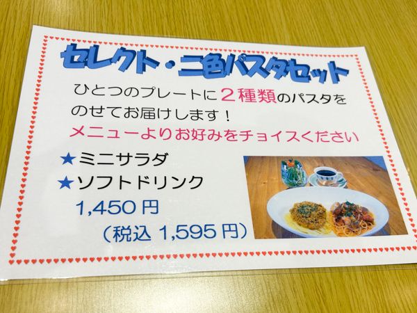 皆さんも、たくさんのパスタの中から一つなんて選べない…と思ったことがあると思います。 そんなお悩みを解消するのがこの「セレクト・二色パスタセット」。 数あるパスタメニューの中から2種類のパスタを選べて、さらにミニサラダとソフトドリンクがついて税込み1,595円です。