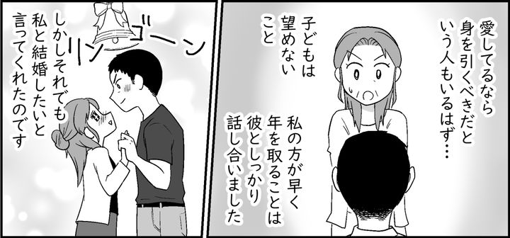 子どもは持てないこと、私の方が早くおばあちゃんになってしまうことは、タカちゃんとも話し合いました。けれどタカちゃんはそれでも私と結婚したいと言ってくれたのです。さっきのユウコさんの様子を思い出すと、胸が痛みますが……。
