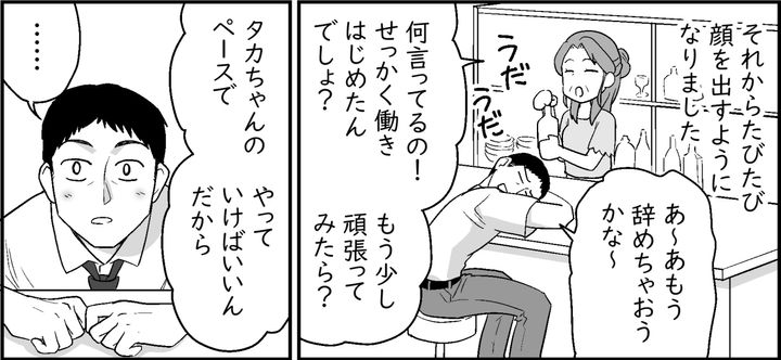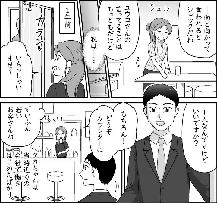 タカちゃんと出会ったのは1年前。いつものように常連さんたちとお酒を飲んだりカラオケをしたりしていると、近くで働きはじめたタカちゃんがフラリと入ってきたのです。やがて常連になったタカちゃんは私に告白してきました。