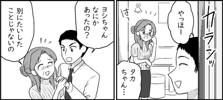 けれどここまできっぱりユウコさんに言われてしまうと、やはり気がふさぎます。ユウコさんの心の内を思うと、私も苦しいです。そんな私の様子を見たタカちゃんは、なにかあったのか、なんでも話してほしいと言ってくれるのでした。