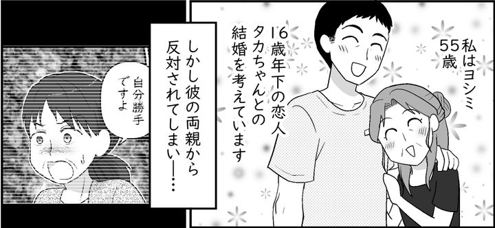 私はヨシミ(55歳)。16歳下の恋人タカちゃん(タカアキ)との結婚を考えています。ようやく息子家族の理解を得られ、タカちゃんのご両親にも挨拶に行ったのですが、やはり年の差を理由に反対されてしまいました。その後タカちゃんのお母さんであるユウコさん(62歳)から「2人で話がしたい」と言われて私のお店に来てもらうことに。しかし自分勝手だと責められ、私の方から身を引くように言われてしまいます。ユウコさんがお店から出て行ったあと……。