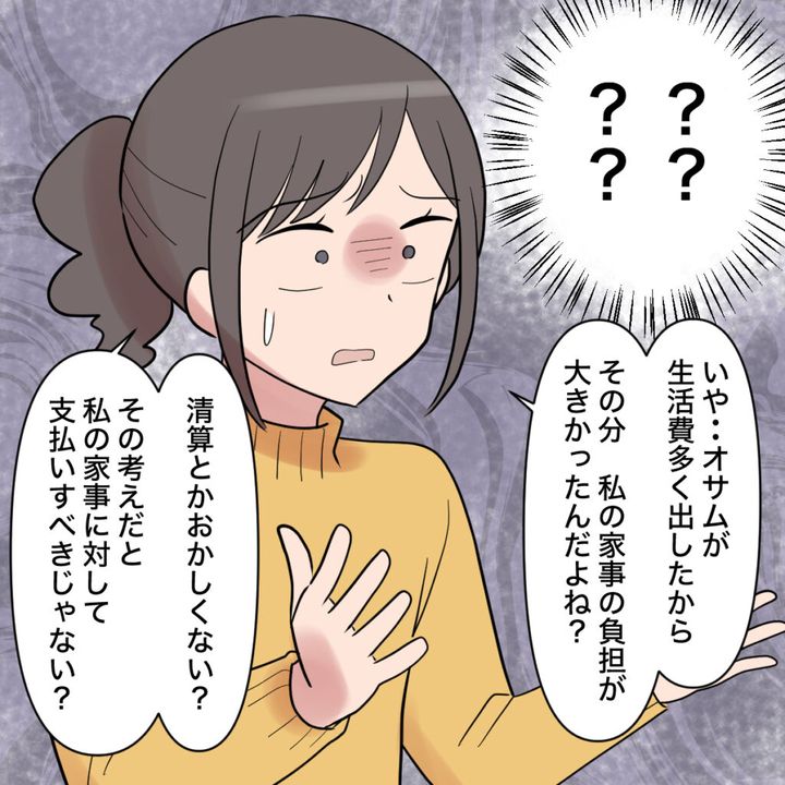 「????」訳がわからなくなりました。「いや・・おさむが生活費多く出したから、その分私の家事の負担が大きかったんだよね?清算とかおかしくない?その考えだと、私の家事に対して支払いすべきじゃない?」とたずねると、