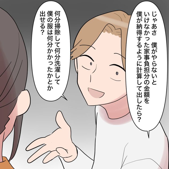 「じゃあさ、僕がやらないといけなかった家事負担分の金額を僕が納得するように計算して出したら?何分掃除して何分洗濯して、僕の服は何分かかったとか出せる?」と真顔で言い始めました。