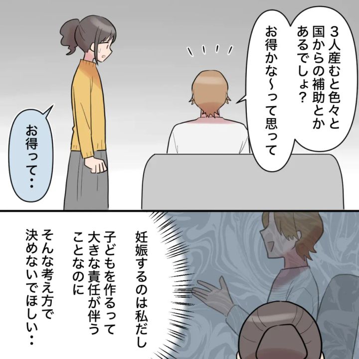 「3人産むと色々と、国からの補助とかあるでしょ?お得かな~って思って」オサムの言葉に「お得って・・」と呟く私は、「妊娠するのは私だし、子どもを作るって、大きな責任が伴うことなのに・・そんな考え方で決めないで欲しい・・」