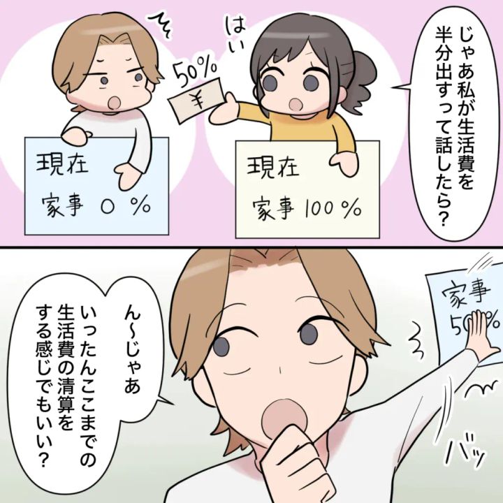 「じゃあ私が生活費を半分出すって話したら?」と提案すると、「ん~じゃあ、いったんここまでの生活費の清算をする感じでもいい?」とオサムが言い出して、