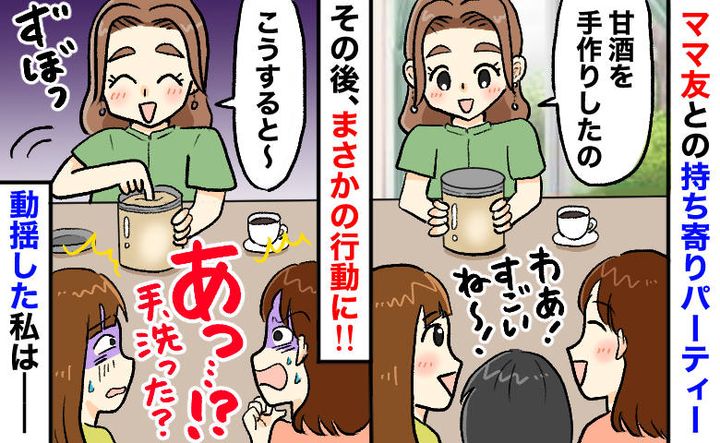 ママ5人ほどが集まったのですが、ひとりのママが持ってきたのは、なんと炊飯器で手作りしたという甘酒。ここまではよかったのですが、「温度をたしかめるね!」と言って、洗ったかどうかもわからない自分の指を甘酒に入れてかき混ぜ、そのまま口へ……。まるで体温を測るかのように「うん、これはいい!おいしい!!」と、得意げにお披露目したのです。そして「さあ、これを飲んで!」と、まさかの“指を突っ込んで温度確認した甘酒”を私たちに差し出してきたのです……。