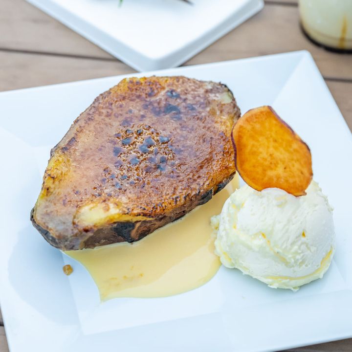 九州産のサツマイモ「紅はるか」を丸ごとブリュレにした、見た目も味も満足できるスイーツ。提供直前にキャラメリゼする本格派です!