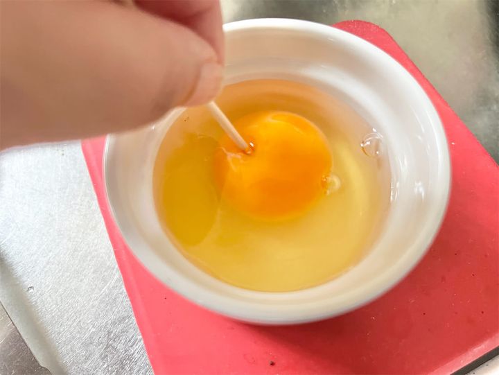 水は大さじ2〜3ほど入れました。黄身に穴を開けないと破裂する恐れがあるので、注意してくださいね。
