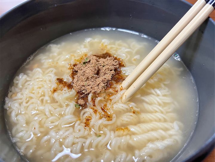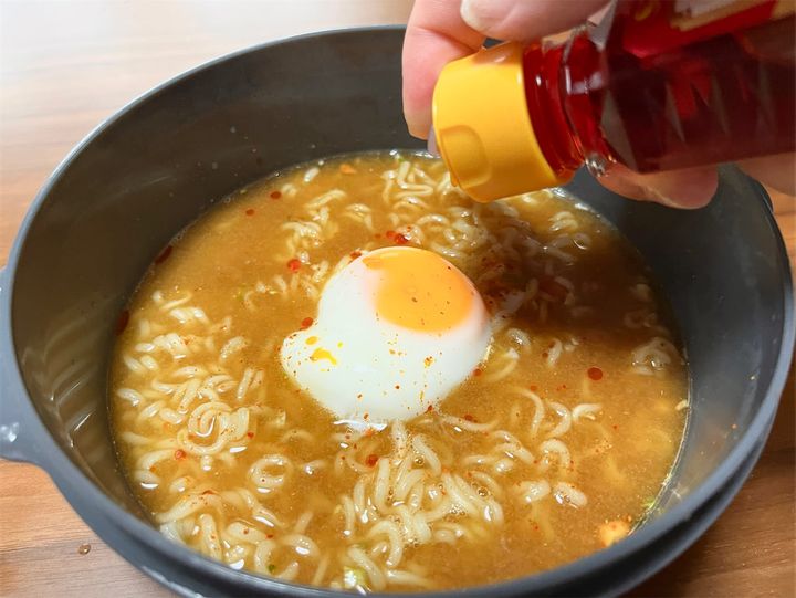 4. 3にスープの粉を入れ、軽く混ぜる。1の温泉卵を中央に乗せ、付属の七味唐辛子をかけたら完成。