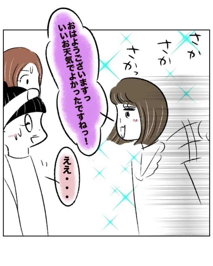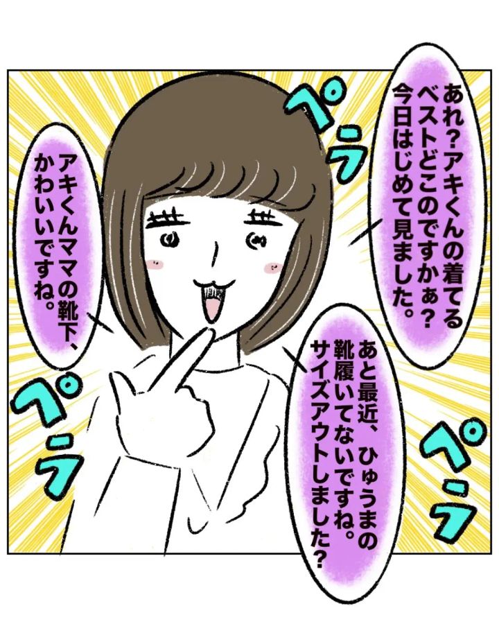 ハイテンションのゆかちゃんママは「あれ?アキくんの着てるベストどこのですかぁ?今日はじめて見ました」「あと最近、ひゅうまの靴履いてないですね。サイズアウトしました?」「アキくんママの靴下、かわいいですね」と一方的にペラペラと話しかけてきます。