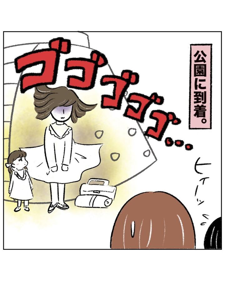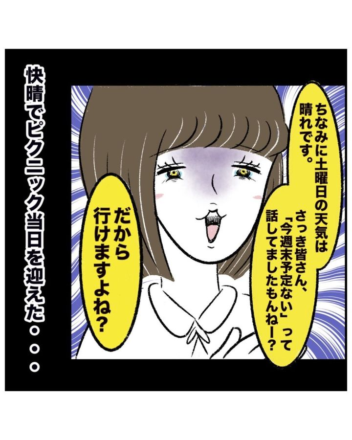 児童館で出会ったゆかちゃんママからストーカーのように執着されるようになり恐怖を覚え、しばらく児童館に行くのをやめていたものの、仲良しのマキちゃんママに誘われまた児童館に行き始めたまるさん。しかし、やはりゆかちゃんママは空気を読まない言動ばかり。まるさん達が仲良しグループで計画していたたこやきパーティーに強引に参加しようとしてきたゆかちゃんママでしたが、マキちゃんママが「また今度公園でピクニックとかにしよう」と押し切りたこやきパーティーの話はなくなりました。しかしホッとしたのも束の間、今度はピクニックの日程を決めるために連絡先交換をしようと迫られますが、児童館の先生が「スマホは使用禁止」と注意してくれてピンチを免れます。すると、ゆかちゃんママは「じゃあピクニックは今週の土曜日の10時にKY公園集合で」と日時と場所を指定し、「さっき皆さん『今週末予定ない』って話してましたもんね?だから行けますよね?」と断る口実を作らせません。気が進まないながらもピクニックの約束が決まってしまったまるさんは雨が降って中止になることを期待していましたが、当日の朝起きてカーテンを開けると残念ながら快晴でした。