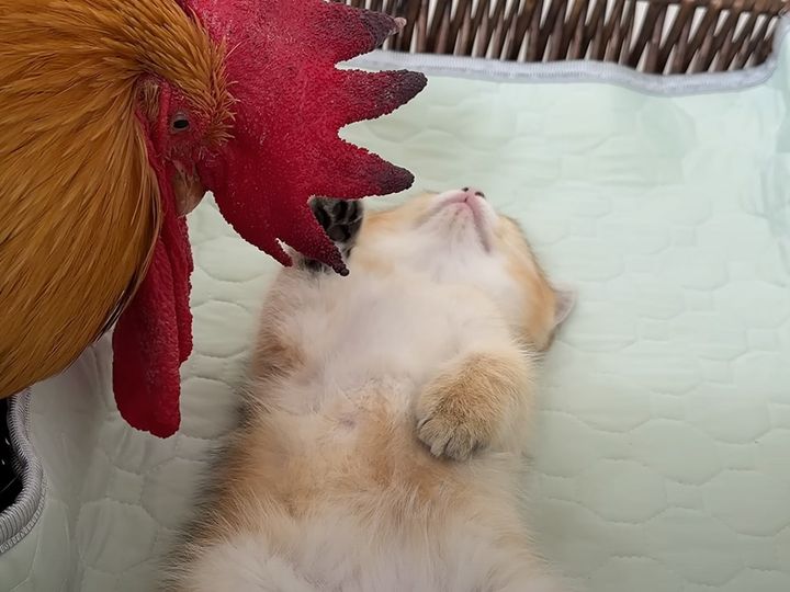 3. 「生きてるよね?」子猫の熟睡に本気で焦る雄鶏、“心配しすぎアクション”にキュン