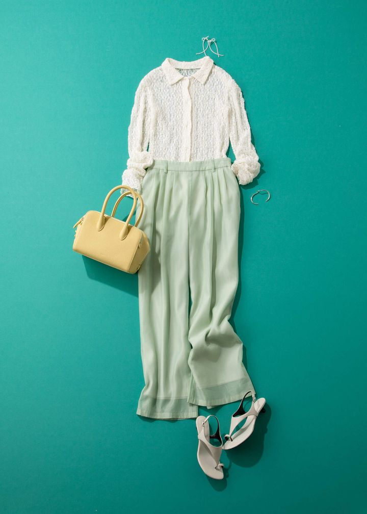 シューズは履き回し。ブラウス¥17,600(ザ ポーズ/ウィム ガゼット)パンツ¥24,200(アルページュストーリー)バッグ¥53,900(ヴァジック/ヴァジックジャパン)ピアス¥23,100<カラ・ユ>バングル¥23,100<ニナ・エ・ジュール>(ともにショールーム ロイト)