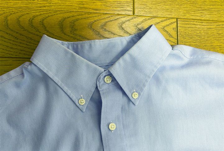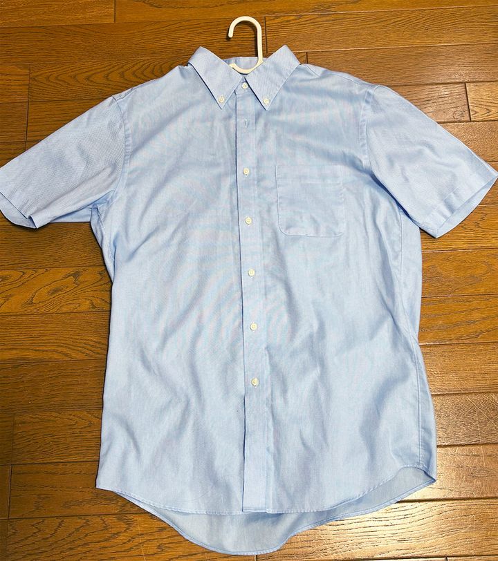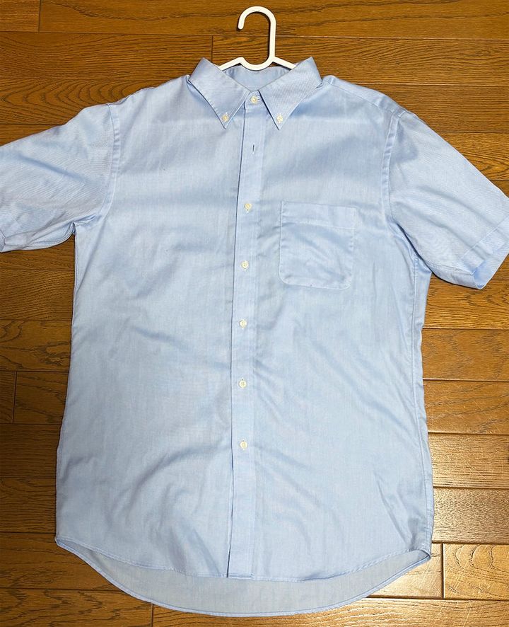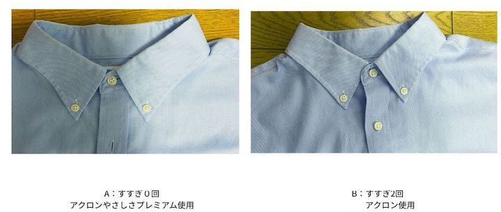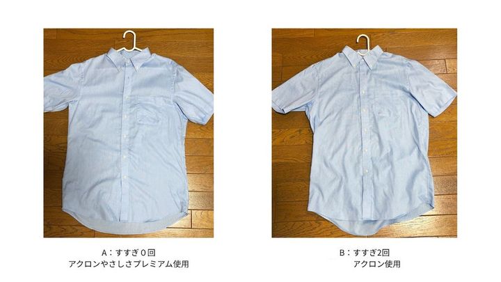 今回の検証では、普段夫が着ている半袖のボタンダウンシャツ(綿100%)を、A 「アクロンやさしさプレミアム」(すすぎ0回)と、B「アクロン(柔軟成分入り)」(すすぎ2回)でそれぞれ洗いました。その後、すぐに部屋干しして、乾いた際の「シワ、ヨレ」などを比較してみます。