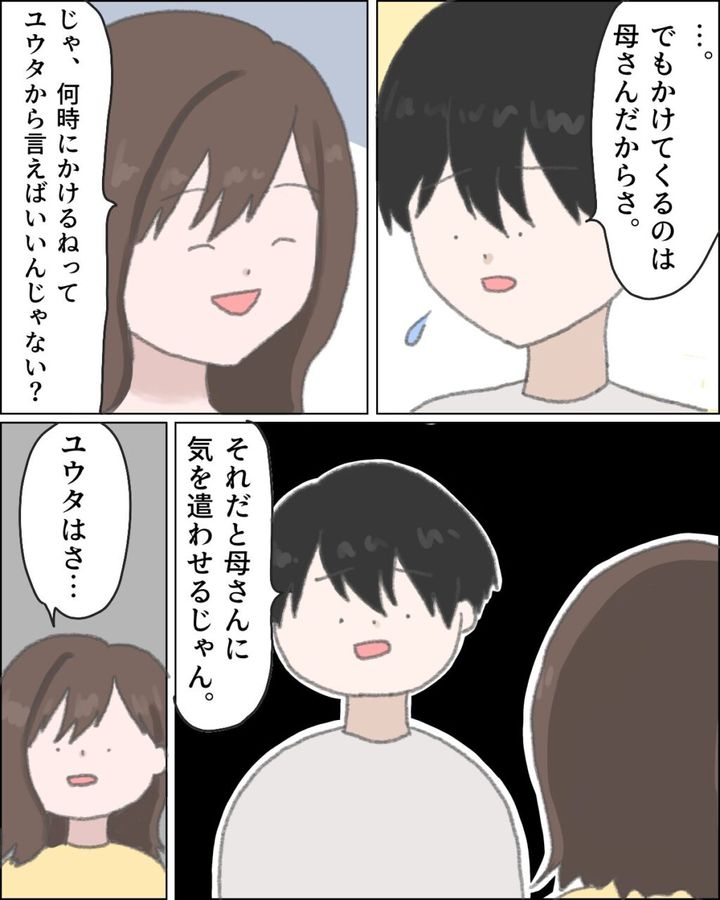 「いい加減にしてよ!!」と怒り出すユウタに、「えっ?何が?」と言うと、「いつも母さんとの時間を邪魔してさー」と怒りながら言うユウタに、