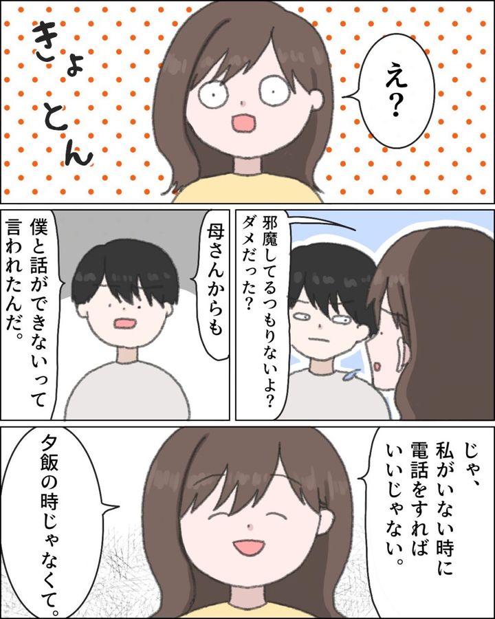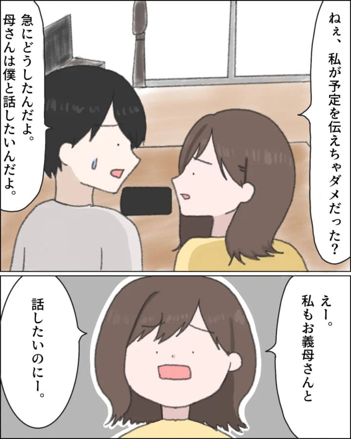 義母が電話を切った後、「私が予定を伝えちゃダメだった?」とカナコさんが言うと、「母さんは僕と話したいんだよ」とユウタさん。その後も、義母から電話がかかってくる度に、テレビ電話の画面に割り込むカナコさん。そのうち「いつも母さんとの時間を邪魔する」とユウタさんに叱られてしまい、「夕飯の時間じゃなく、私のいない時に電話すればいい」と言うも、最終的に「母さんに気を遣わせるじゃん」と言われ、「ユウタはさ・・」と切り出しました。