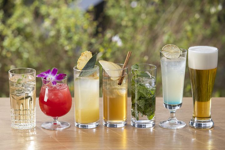 左から:檜のハイボール、パッションブリーズ(ノンアルコール)、パイナップル&トニック(ノンアルコール)、銀ぱちセイロンティーモスコミュール、フローラルモヒート、スカイパローマ、ビール