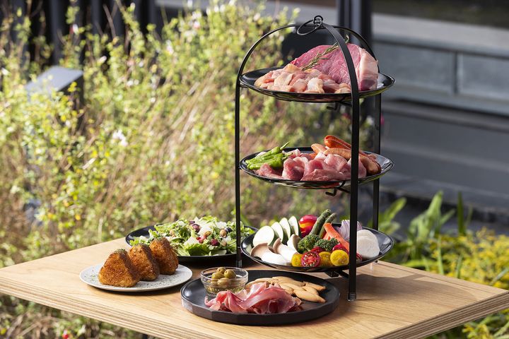 食材はアフタヌーンティーのような3段スタンドで提供。一部を除き、肉類は松屋銀座地下1・2階で取り扱いしているものを提供。