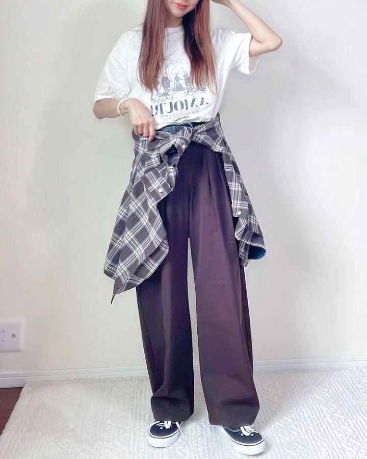 ゆとりのあるシルエットが印象的なチノバレルレッグタックパンツは、カジュアルコーデでも大活躍します。定番でありながら2025年のトレンドでもあるプリントTシャツを合わせるだけで、シンプルながらも今っぽさたっぷりのコーディネートに。ちょっと物足りないときは、@qyun._katm0.00さんのようにチェックシャツを腰に巻くのもおすすめです。