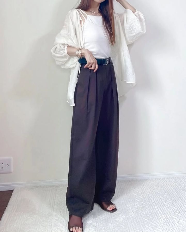 こちらは、ギャザーブラウスを合わせた女っぽさ漂う大人女子コーデ。パンツのルーズなシルエットが絶妙な抜け感を演出しています。@asamimiiiiさんは、ベージュのチノバレルレッグタックパンツに白のトップス、ブラウンのサンダル、バッグをチョイス。全体の色味をまとめることで、統一感のある上級者コーデに仕上げています。