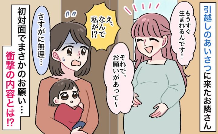「最近、隣に引っ越してきたんです〜」と言われました。しかしその女性は、引っ越しのあいさつに来たのかと思いきや、「もうすぐ子どもが生まれるんです〜」と話し始め、「それで、お願いがあるんですけど……」と言ってきたのです。