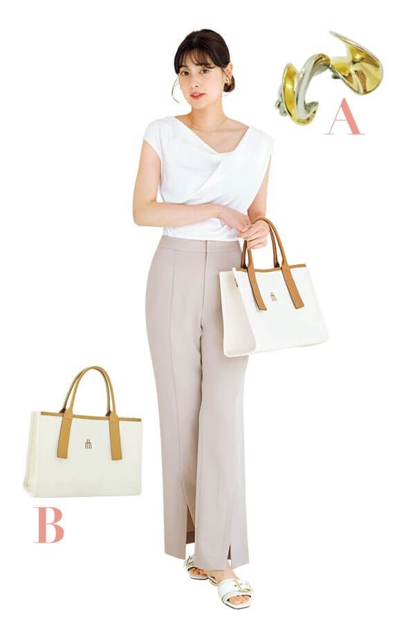 「服から小物まで、すべてHLTでそろえた通勤コーデを提案! ホワイトベージュのワントーンと色みはシンプルですが、トップスのドレープデザインやサンダルの大きめバックルなど、細部で上品さを感じるコーディネートに仕上げました。トップスは涼しげなカットソー生地で、なんと洗濯機OK。汗をかいてもお家で洗える安心感がうれしい♡」