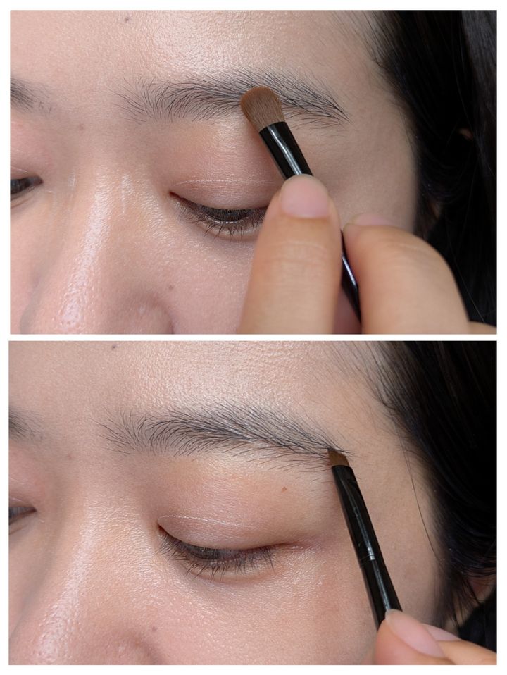 出典:MORE①眉頭を除いて眉全体にふんわりのせる②カットブラシで眉尻の毛を書き足すようにささっと描く