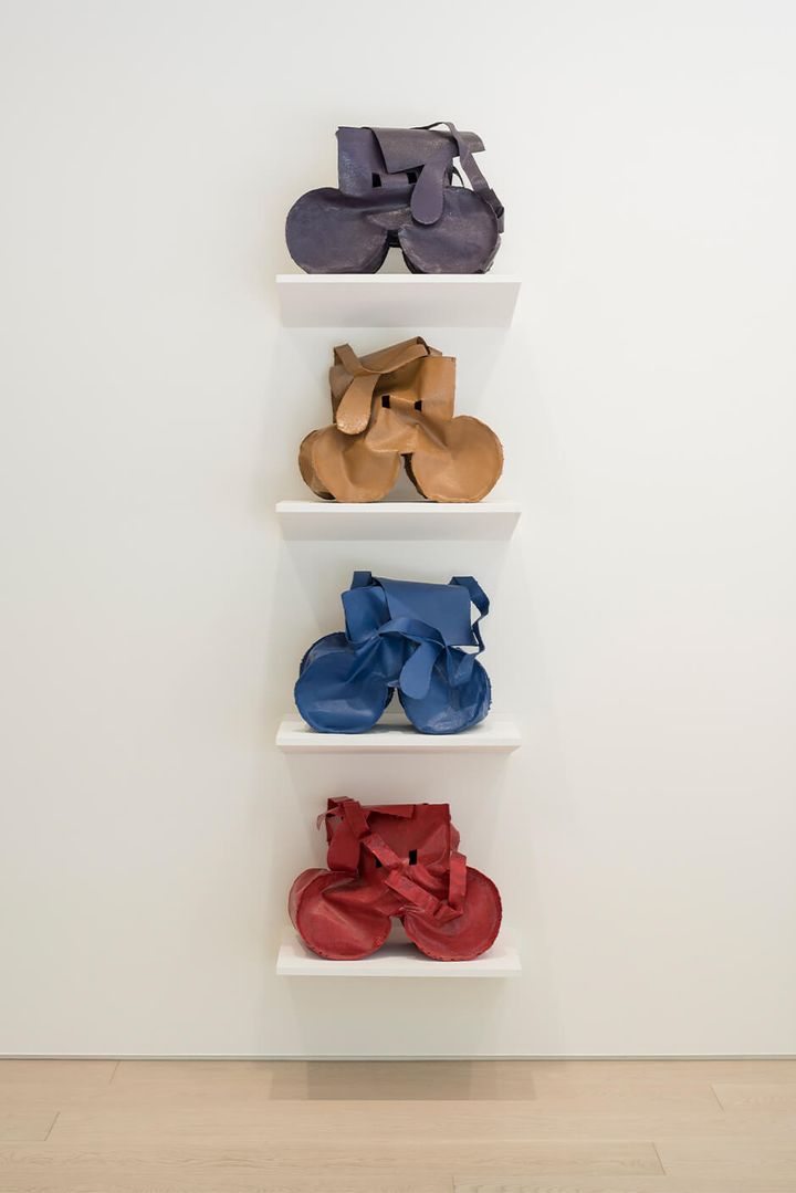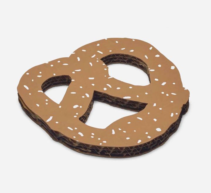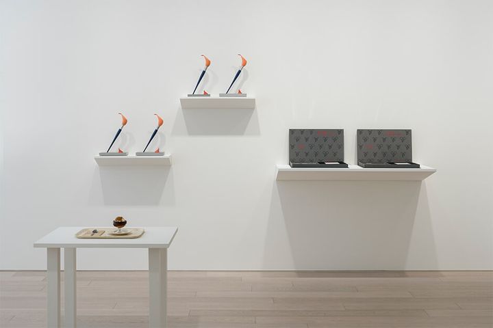 会場に並ぶのは、塗装した段ボールで制作した「N.Y.C. Pretzel」(1994)のマルチプル作品を約60点入れた⾃動販売機型のショーケースをはじめ、塗装されたアルミニウムと真鍮で制作されたシュークリーム「Profiterole」(1989‒1990)、縫製されたキャンバス素材による「Mouse Bags」(2007‒2017)など。