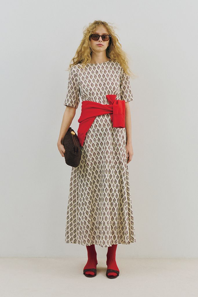 やわらかいコットンにかすれたボルドーの小花柄がやさしい雰囲気。五分そでや高めのウエスト位置、ドラマティックなフレアのシルエットも相まって、ノスタルジックな面持ちに。スエットやソックスで赤をひろって、装いにアクセントを。