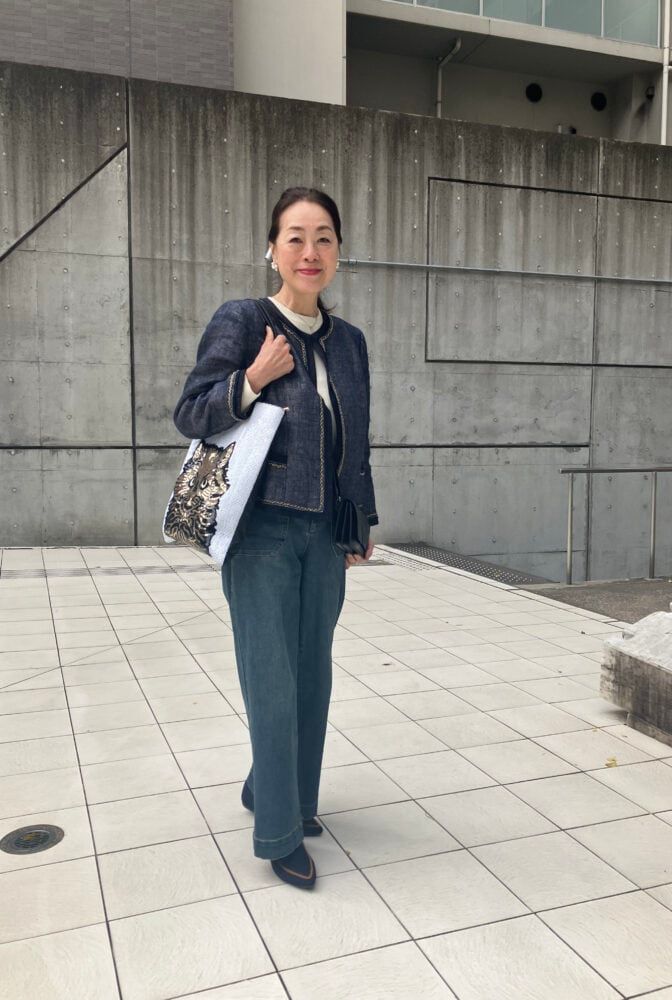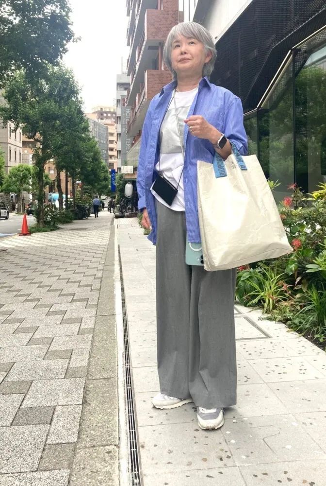 「グレーヘアにしてから、落ち着きがありつつも明るい印象になるコーディネートを心がけています」という深田さん。この日は、いまっぽいワイドシルエットのパンツに、オーバーサイズの爽やかなブルーのシャツを合わせ、程よくこなれた品のある大人の着こなしをしています。