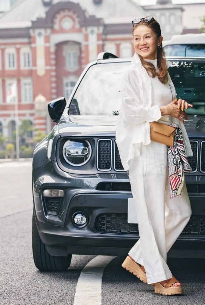 夏のオールホワイトは、シンプルなアイテムでまとめて小物でアクセントをつけるという伊藤さん。「清涼感のある麻素材で涼しさを演出しました。ゆるっとしたサイズ感に惹かれたパンツとシャツは、今季ユナイテッドアローズで購入しました」。サンダルは「エルメス」。