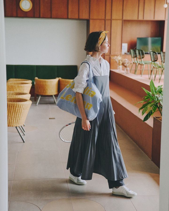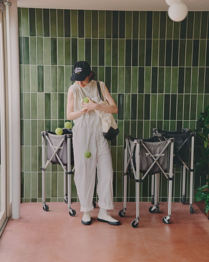 今から使うテニスボールを集めながら、なんとなく考え事をしていたら、気づけばいくつか足元にぽとり、ころり! 今日はモノトーンの装いだからか、転がる蛍光色のテニスボールがなんだかいつもよりまぶしく見えた。ホワイトのオーバーオールは、ハイネック×ニットベストを仕込んで品よく。小物と足元に効かせたブラックが、甘さをすっと引き締める。潔い配色に、ブラックソールが小粋な《ワクワ》のスニーカーでスタイリングにいいリズムを刻む。