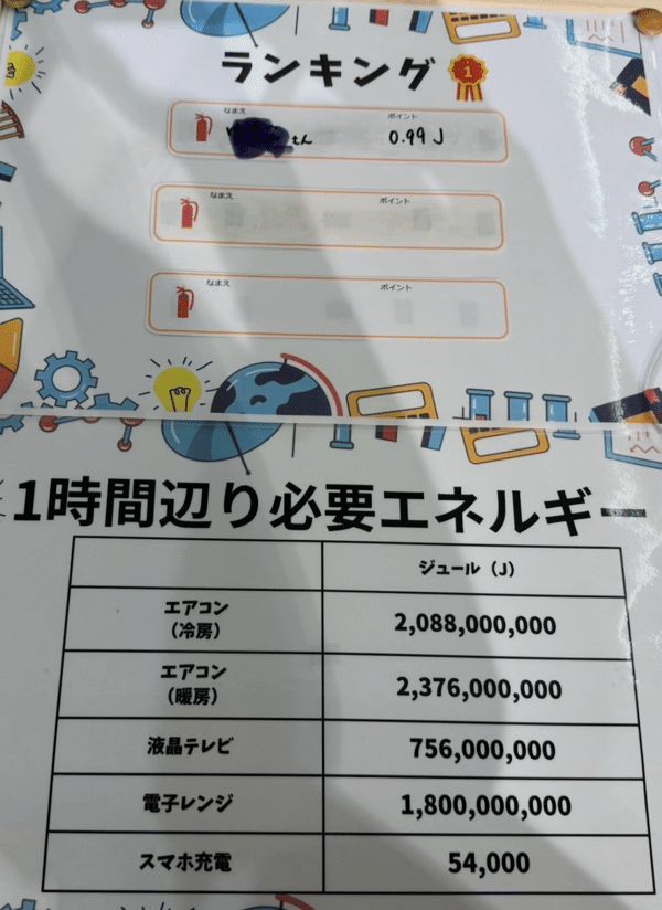 よ〜い、スタートの掛け声のもと、10秒間髪を振り乱して必死に回すと・・・結果は0.99ジュール。「こんなに回しても、テレビつかないの!?」とがっくり。日頃使うエネルギーの大きさを実感できる仕掛けになっていました。